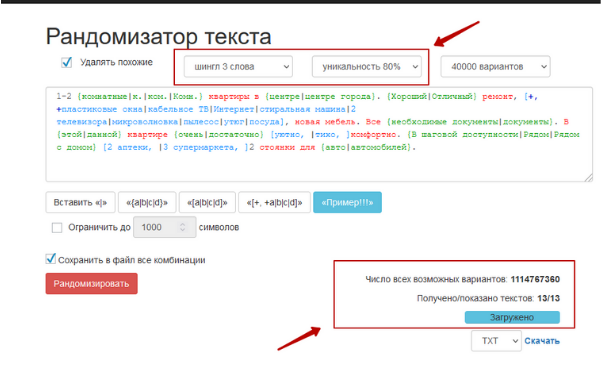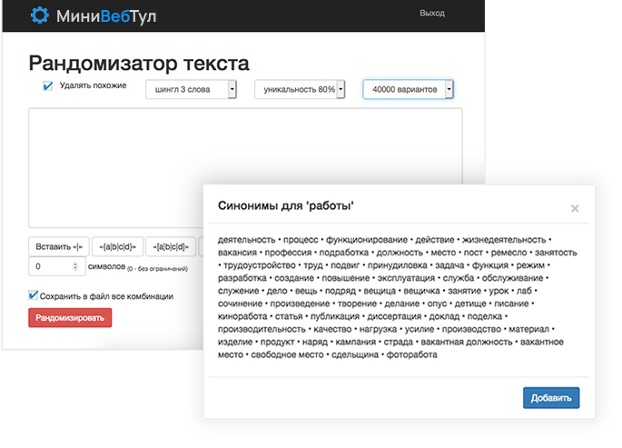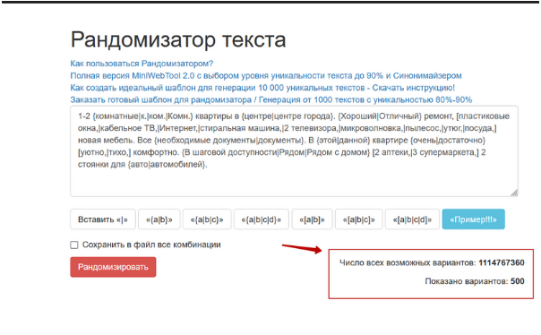 Данный функционал требуется при работе с текстами, в которых есть ограничение по количеству символов. Рандомизатор отберет только те варианты, которые будут не больше указанного количества символов. При обнуленном параметре, данное ограничение будет отключено